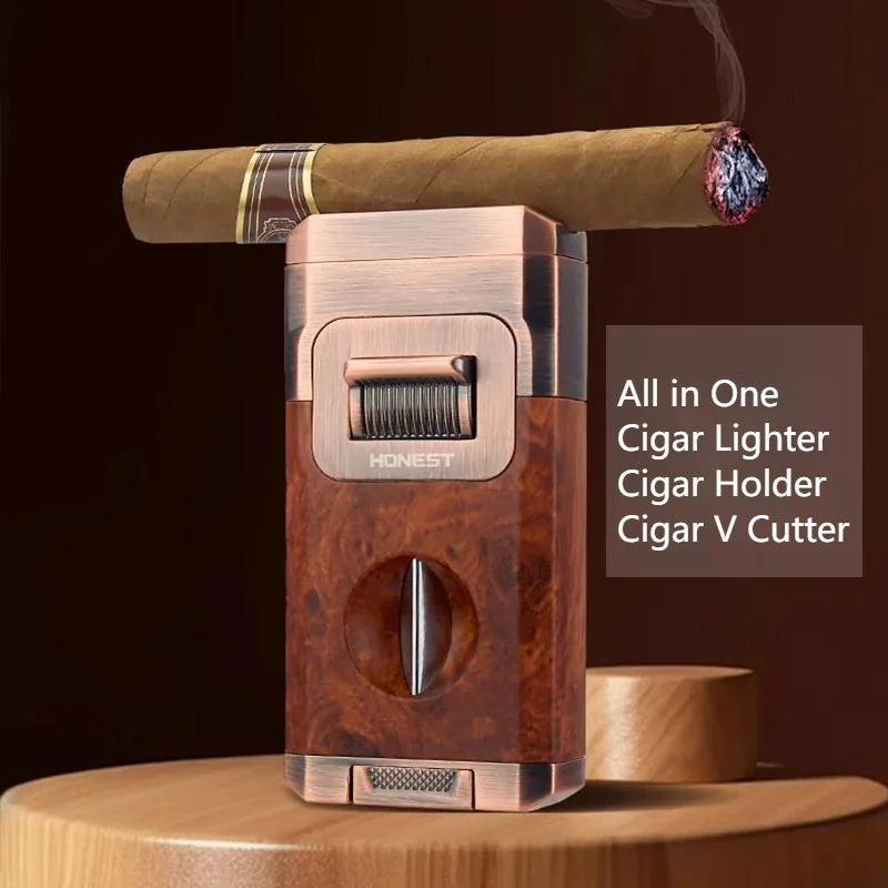 2024 Unique Cigar Lighter With V Cutter Cigar Holder Double Jet Flame Butane Refillable Torch Lighter Luxury Cigar Accessories