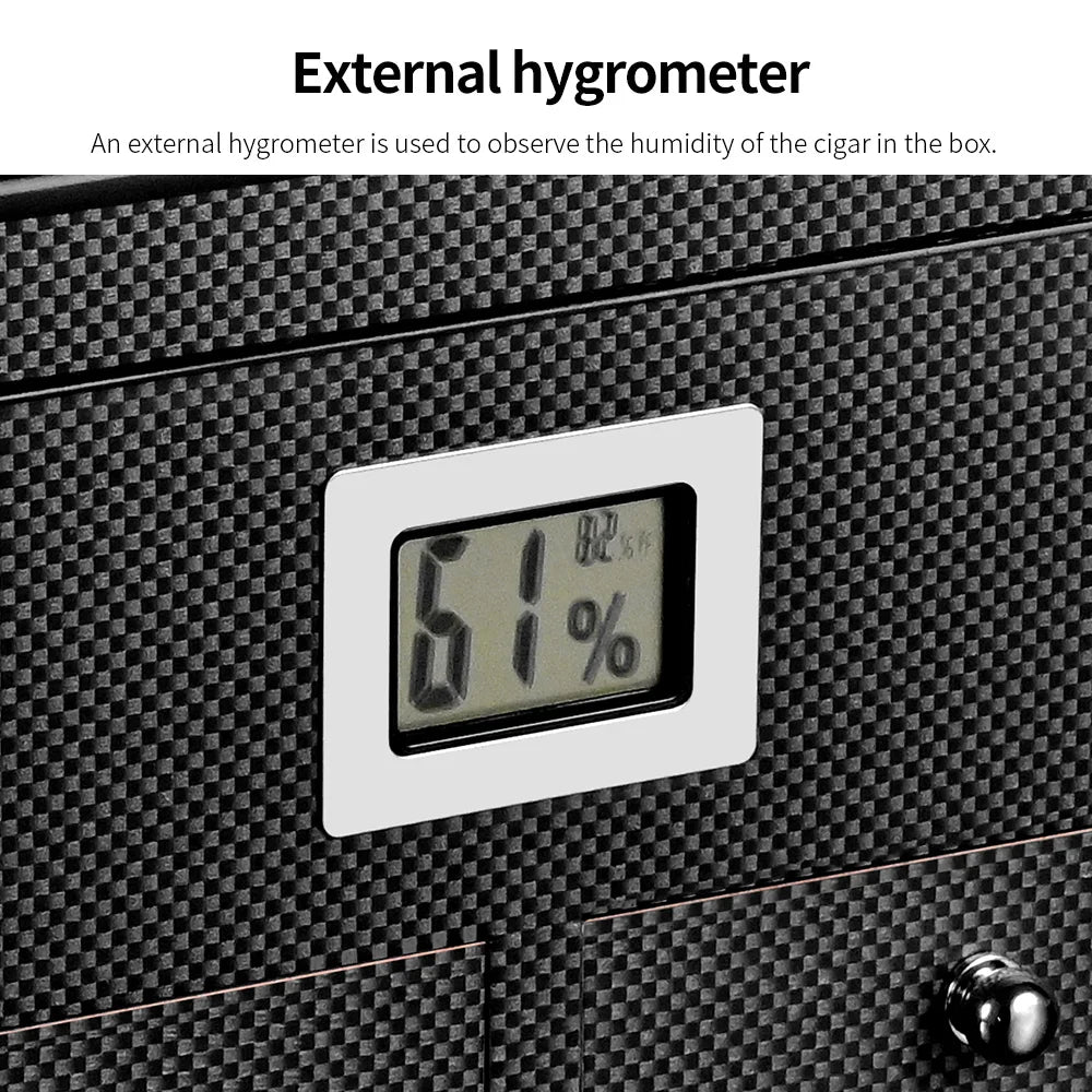 An external hygrometer is used to observe the humidity of the cigar in the box